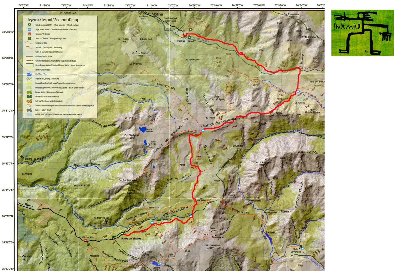Gracias por el mapa, muy claro y detallado, se va de impresión y a la mochila!!. Me entusiasmo la idea de subir a la laguna y bajar por el sendero del enladrillado hasta el segundo punto de acampada. La foto es magnifica y me recuerda el paisaje del morrillo que queda cerca y donde campamos un par de veces hace años. La caminata o trekking es un mundo nuevo al que estamos incorporándonos después de muchos años de paseos en 4x4. No hay dinero en el mundo que pague el ser despertado en la mañana por el trino de un millón de pájaros bajo el dosel de la arboleda Chilena!!!! |