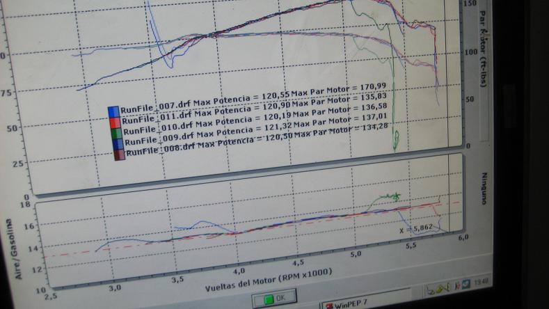 Jorge y Ma Teresa : Hace un par de dias atras fuimos al DYNO para comprobar los hp antes de instalar el cargador y de esta forma tb saber, testear los nuevos hp. Entre las 4800 las 5300 rpm fue donde mejor se elevo la curva de potencia arrojando la no despreciable cifra de 120hp lo que nos puso mas que felices porque no esperabamos tanto, sabiamos de antelacion que el motor standar con neumaticos de fab arrojaban 101hp. Encontra para nos jugaban la doble caja y neumas 33x1250. Efectivamente como lo mencionas el multiple mas el filtro KN son los componentes que marcan la diferencia.En cuanto al chip yo no lo tengo porque mi sc es para 4 psi y el tuyo es de 8 psi y por lo tanto trae de fab tb un quinto inyector. Ambos sc se pueden preparar mucho mas,con lo que te quiero decir que partiremos con los 4 psi hasta mas adelante llegar a bordear los 10 psi con el motor standar el 2rz los aguanta.