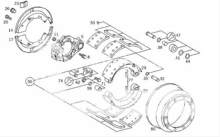Rodillos de las levas, nº47 primera imagen, esos se compran por muestra y diametro, cuando el tambor está en sobremedida y las balatas lo mismo y no frena como se debe, se pone un rodillo mas grande, ya que si es mas chico al girar la leva abre las zapatas y esta se pasan en la excéntrica, se pasa para el lado contrario y queda trabada la balata, para destrabarla hay que desmontar el tambor y las zapatas-balatas para instalarla como corresponde.