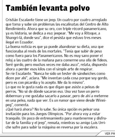 Lo encuentran el la pag 17 del suplemento deportivo de El Mercurio veanlo por aqui....http://impreso.elmercurio.com/_portada/index.asp ![]() Mi reconicimiento a este Tremendo deportista que demostró gran humildad al reconocer en la hora del triunfo a su maestro... eso es nobleza. |